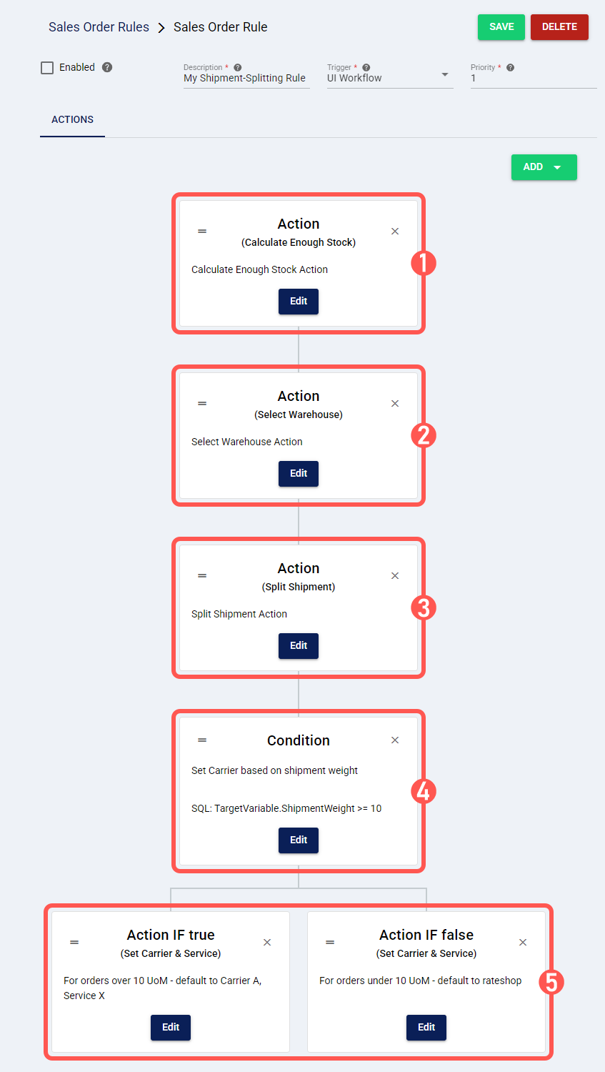 By following the steps below, you can define the maximum number of shipment splits and set the criteria for splitting. This is achieved by setting up a sales order rule and combining the Split Shipment Action with other actions to implement different business logics.