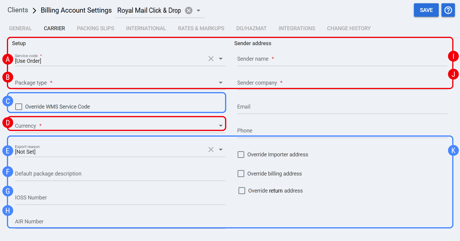 The Carrier tab contains the Royal Mail Parcel Click & Drop-specific configuration used to define operational behavior for this Client (Billing) Account. Fields in this view are grouped visually to distinguish mandatory (red-highlighted items) and optional (blue-highlighted items) carrier-specific settings.
