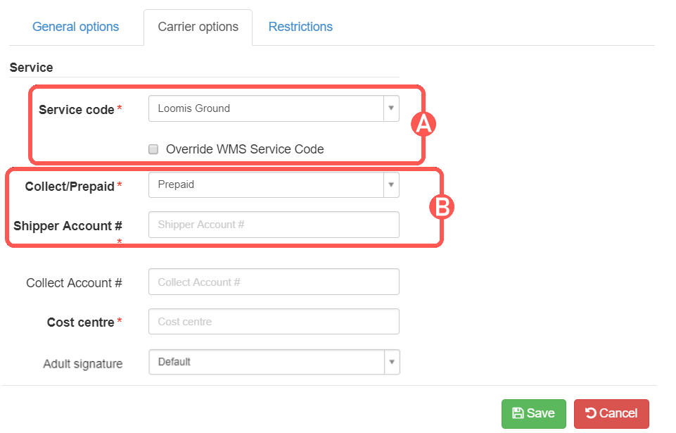 The Carrier Options tab allows to set up basic and advanced features of your Loomis billing account.