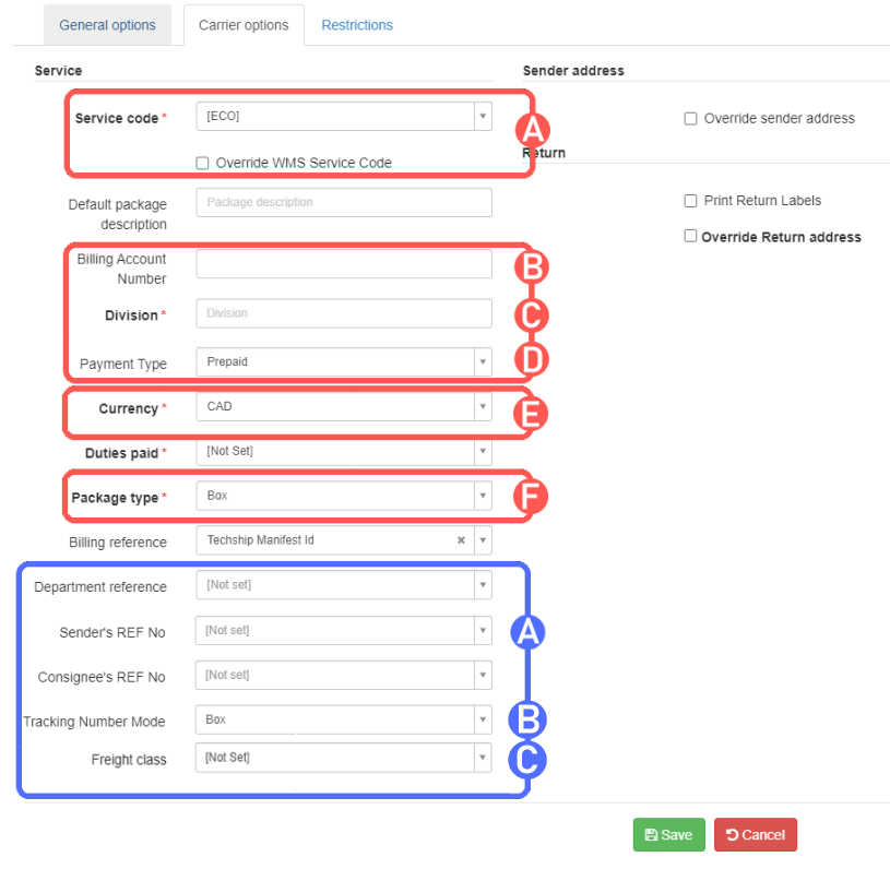 A) Default Service Code: Choose a service code to assign to imported orders which don’t have a service code or keep it if they have. If you wish to overwrite any code coming from the WMS with the chosen service, check “Override WMS Service Code”.