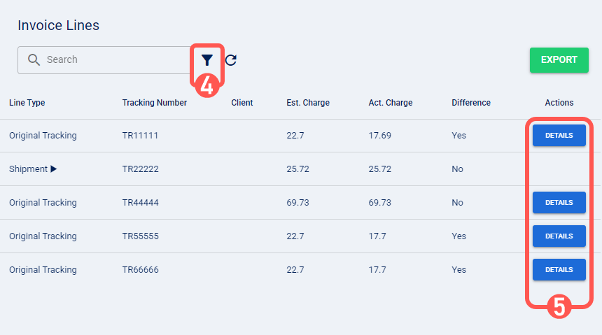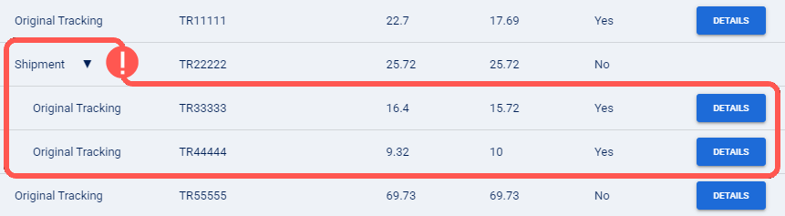NOTE: For more information, refer to: Invoice data is grouped by shipment (master tracking number), allowing you to view both shipment-level and package-level details. If a shipment includes multiple packages, you can expand it to review each one individually.