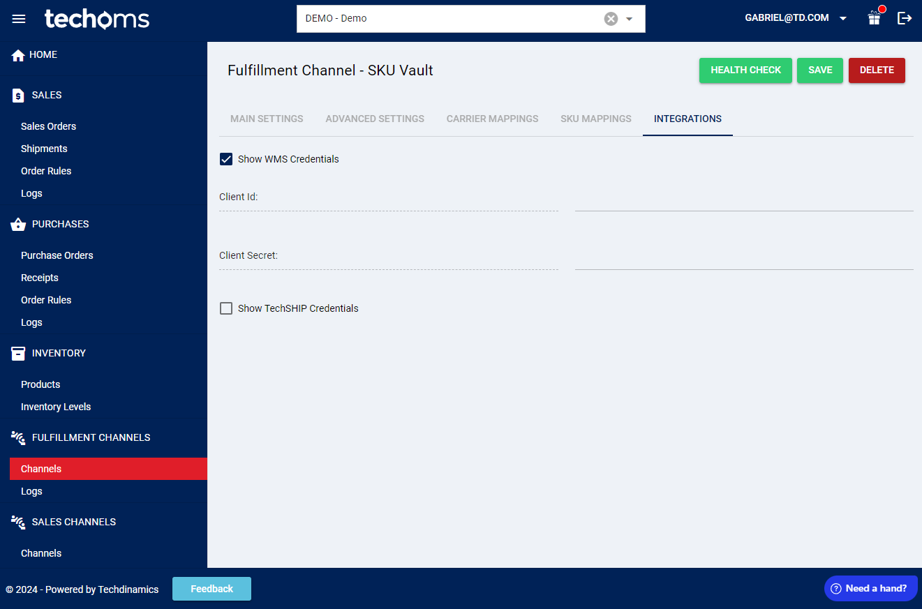 - SKU Mappings: Allows to review and set SKU mappings between the WMS connection and techOMS as detailed here: How to map SKUs in a Fulfillment Channel [Step-by-step guide]
