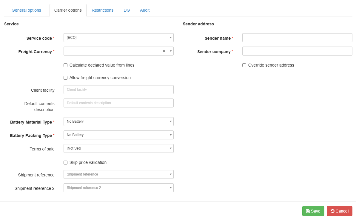 The General Options tab is the same for every carrier. If you are already acquainted with it from previous setups, please configure it accordingly.