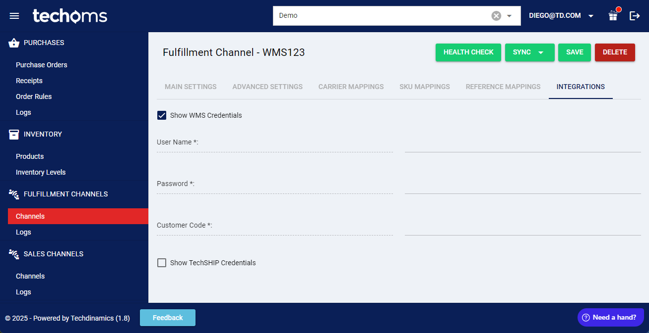SKU Mappings: Allows to review and set SKU mappings between the WMS connection and techOMS as detailed here: How to map SKUs in a Fulfillment Channel [Step-by-step guide]