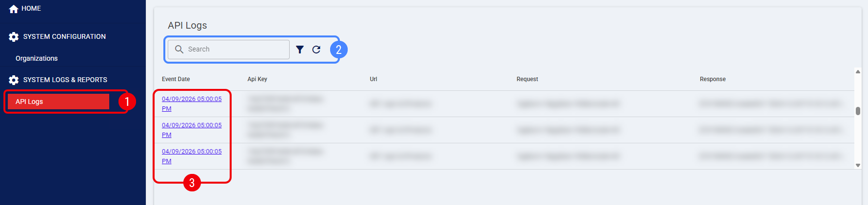 ![]() | Click API Logs from the left menu under the System Logs & Reports section. |