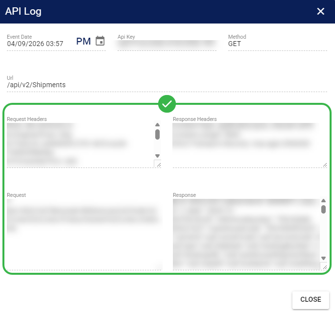 Review the Request and Response sections to validate the data payload and find any errors or success messages. Once finished, click Close to return to the main list.