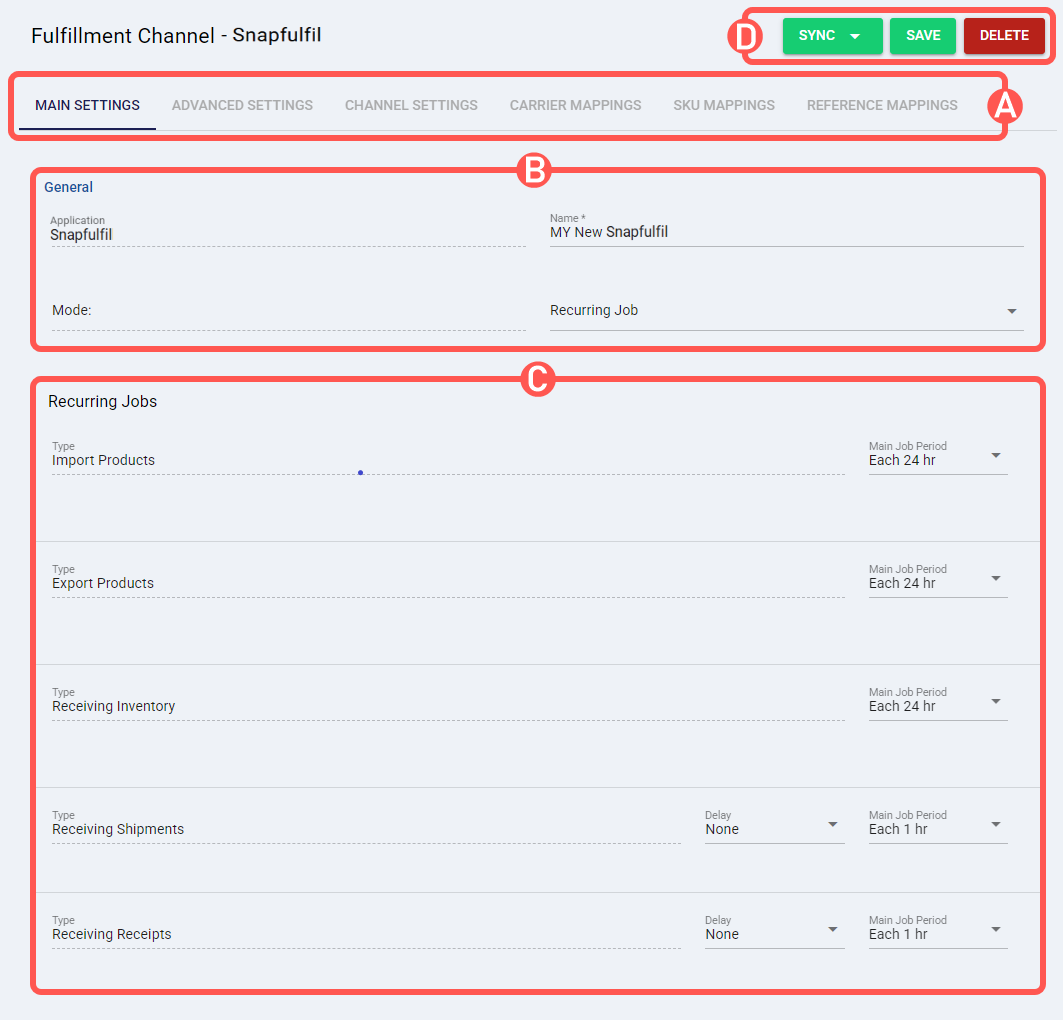 - Main Settings (default): Allows reviewing and setting general settings and recurring jobs. If you wish to set up automations for the channel, follow the steps here: How to configure Recurring Jobs for Sales/Fulfillment channel Automation [Step-by-step guide].