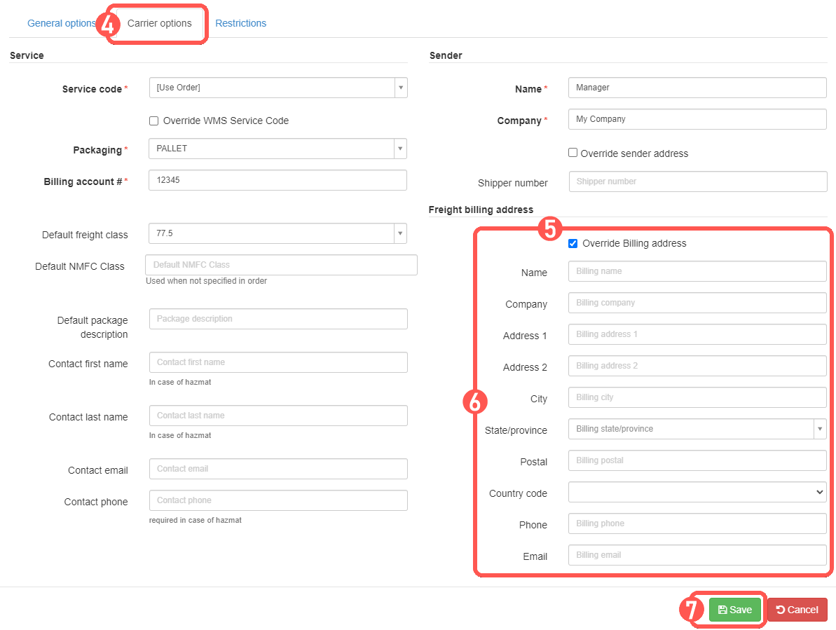 - Freight Payment Terms: Select the type as 3rd Party or Collect according to the case; in the case of Collect, set the Account number as the account that will pay if collect fails