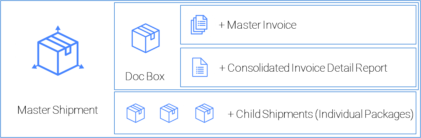 The Master Shipment includes the Doc Box, which contains all the necessary documentation for customs clearance, such as the Master Invoice and Consolidated Invoice Detail report. The packages are then moved and cleared through customs as one unit and later split for individual delivery within the destination country.
