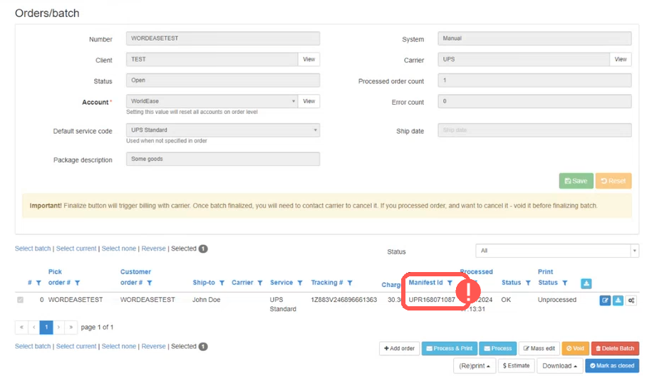 WARNING: You can process UPS WorldEase orders as a batch or individually, they will all add to the same Docbox grouped under the same Manifest ID (visible at the Orders/Batch view) until you close Manifest, when the DocBox is finalized and closed. From that point on, new orders will group under a different Manifest ID and by consequence, a new DocBox.