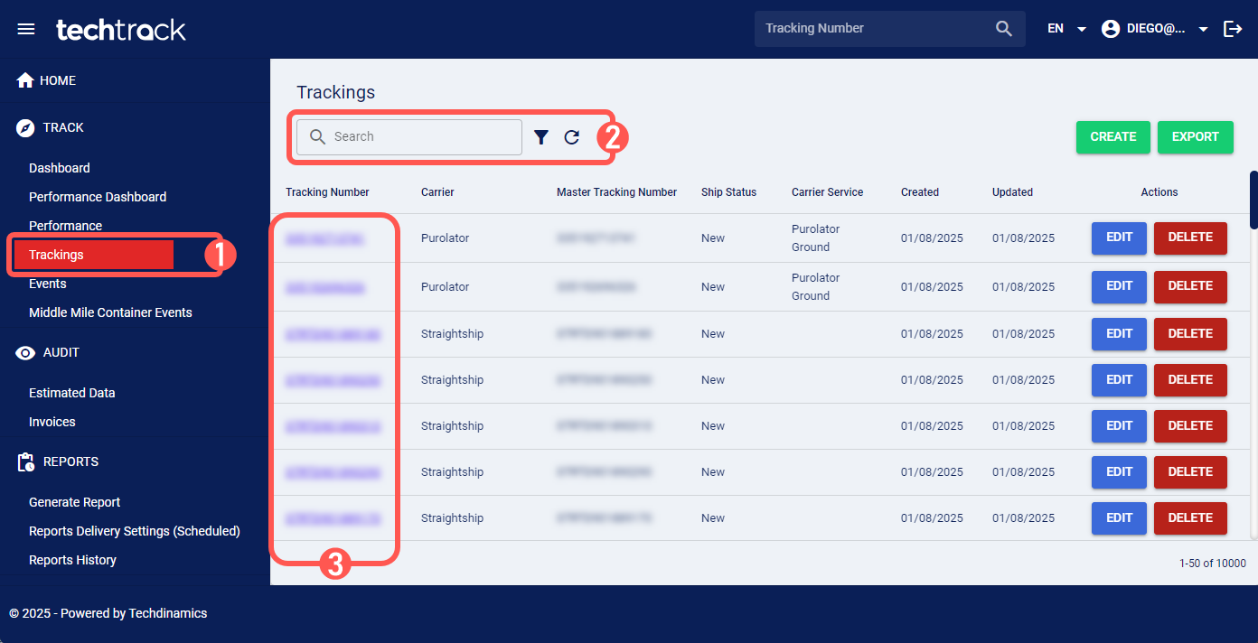 If you do not have the tracking number handy, you can find the shipment manually in the Trackings list.: