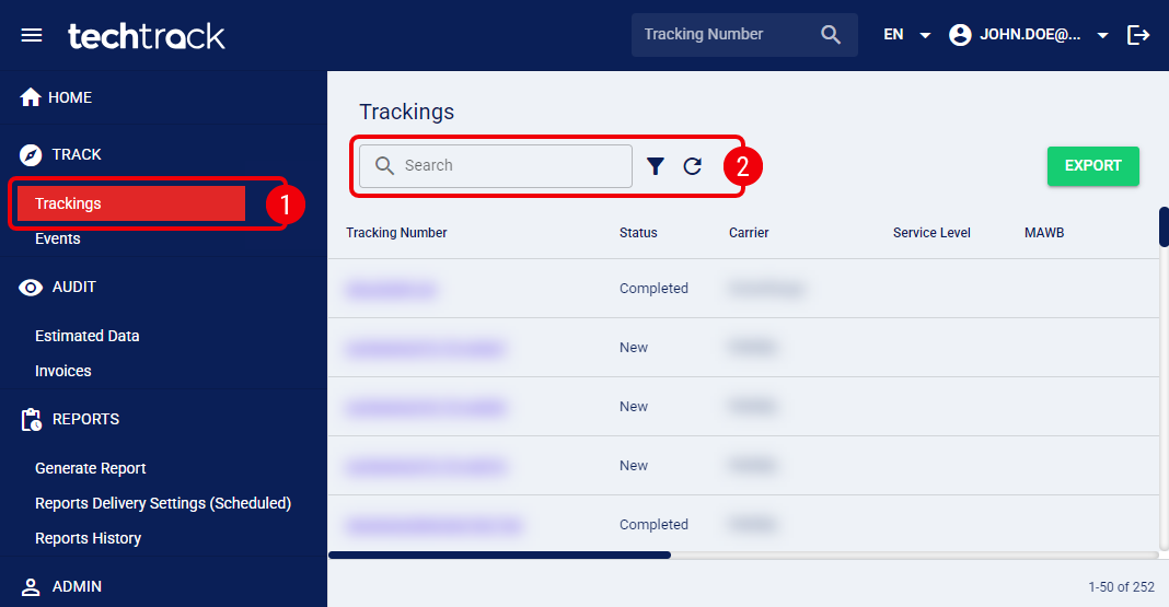 ![]() | Filter the tracking numbers using the Search bar (to quickly search by Tracking Number or Master Tracking Number) or click on the filter icon to apply an Advanced Filter. |