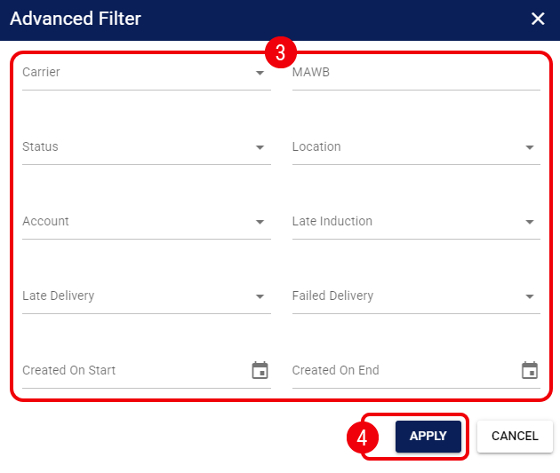 Created On Start / Created On End: Select a date range to filter shipments based on when they were created in the system.