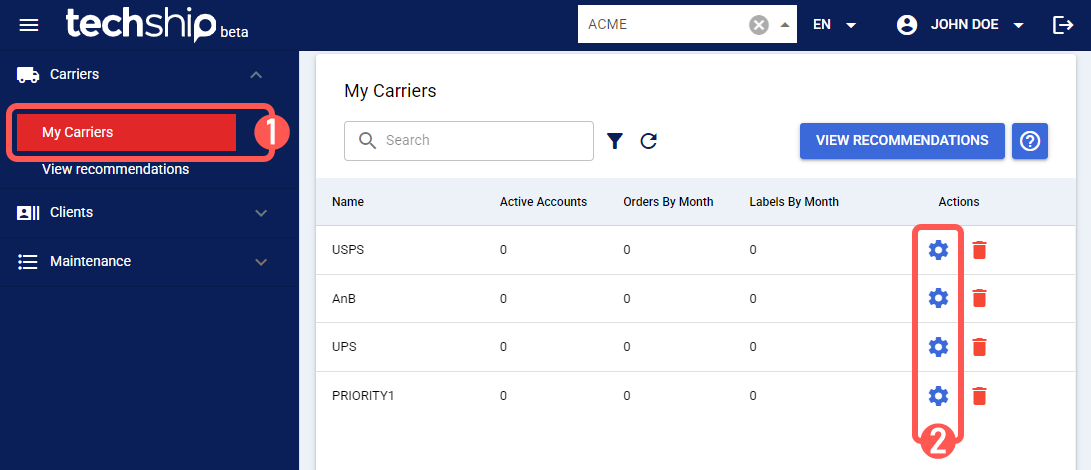 1. Find the desired carrier by clicking on My Carriers from the left menu under the Carriers section.