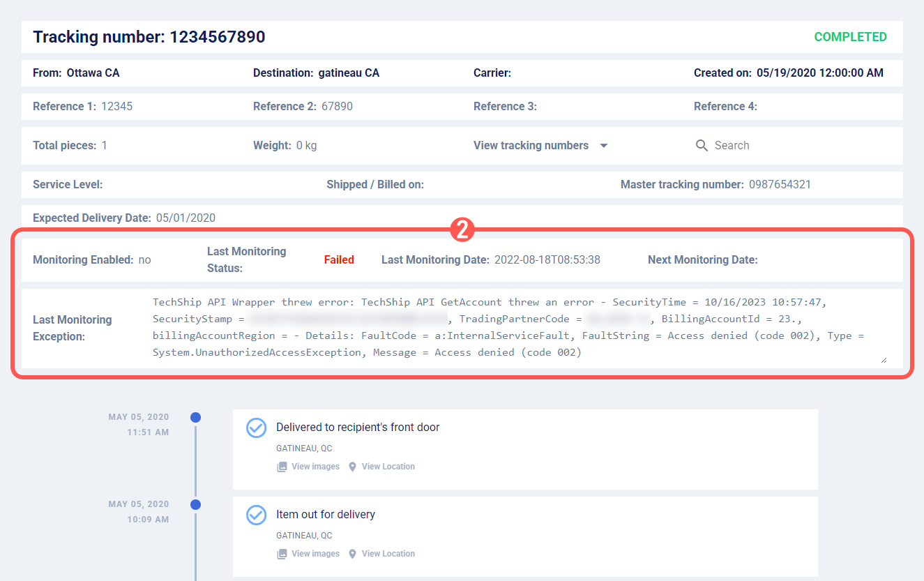 A tracking synchronization error occurs when techTRACK is unable to correctly monitor or record a shipment’s status. For each tracking record, you can review its latest monitoring result, including any exception (error) details if present. This information helps you diagnose and troubleshoot issues.