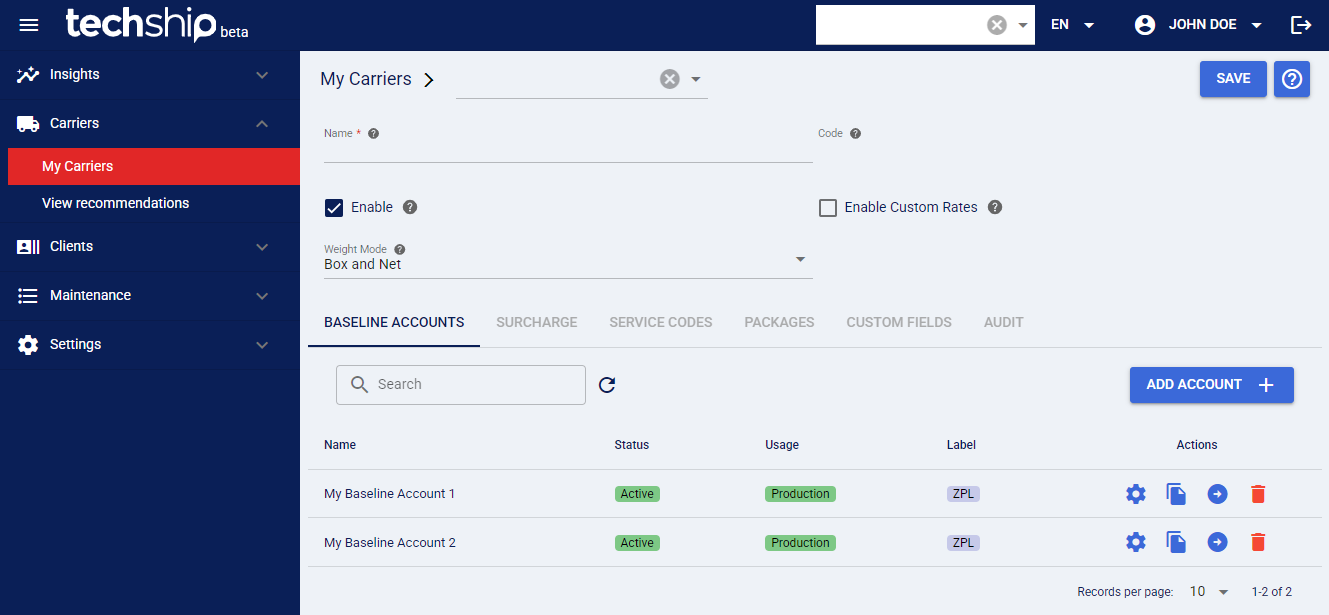 The Client's Billing Account page has been completely redesigned to provide a more intuitive and organized user experience. We've reorganized fields into logical tabs and groups, making it easier to find and configure settings. Key changes include a clearer separation of rate shopping settings, international shipping options, and integrations.