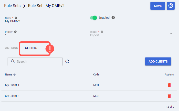 In OMRv2, assigned Clients are visually managed through the Clients tab, allowing for easier overview and modification.