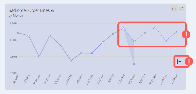 For trend charts, zoom control buttons may be available. Zooming in on the timeline can reveal a future trend forecast based on historical data.