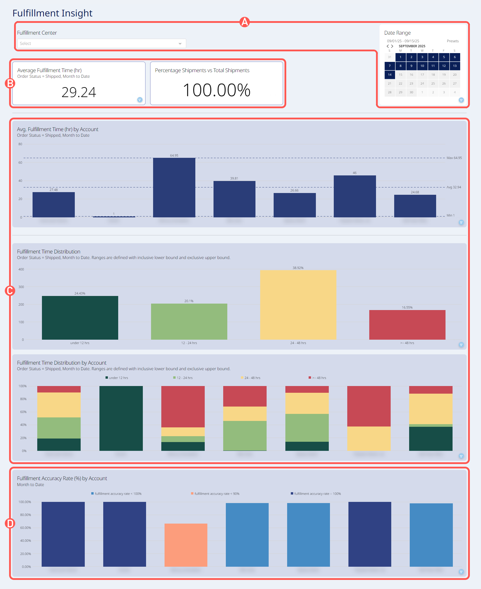 The Fulfillment Insight dashboard provides a detailed view of your fulfillment operations' speed and accuracy. It helps you monitor how efficiently orders are processed and shipped, identify bottlenecks, and track performance. This article provides detailed information on its displayed data.