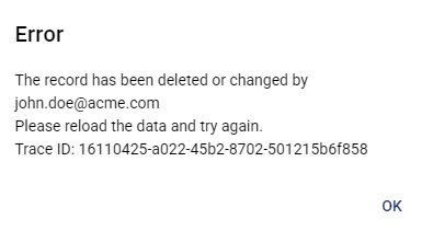 WARNING: The concurrency icon indicates active presence. If a user modifies a record and then closes the page or dialog (leaves), the icon will disappear from your screen. However, if they saved their changes before leaving, the conflict remains. You will not see an icon, but you will still receive a conflict error if you attempt to save.