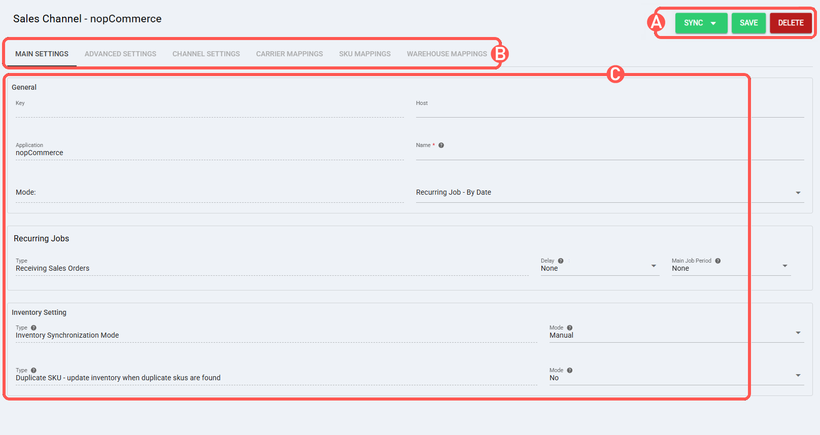 WARNING: Only sales order synchronization is supported. No product sync or inventory sync is available.- Save: Saves and commits changes.