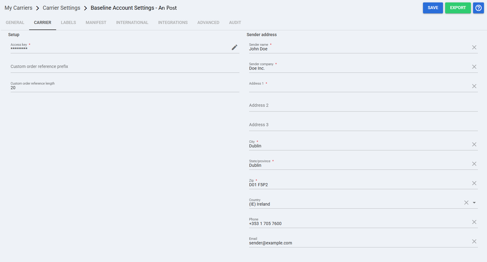 ![]() | Access Key: Stores the credential used to authenticate the Baseline Account against the An Post connection. This field is mandatory and must be configured before shipments can be processed. |