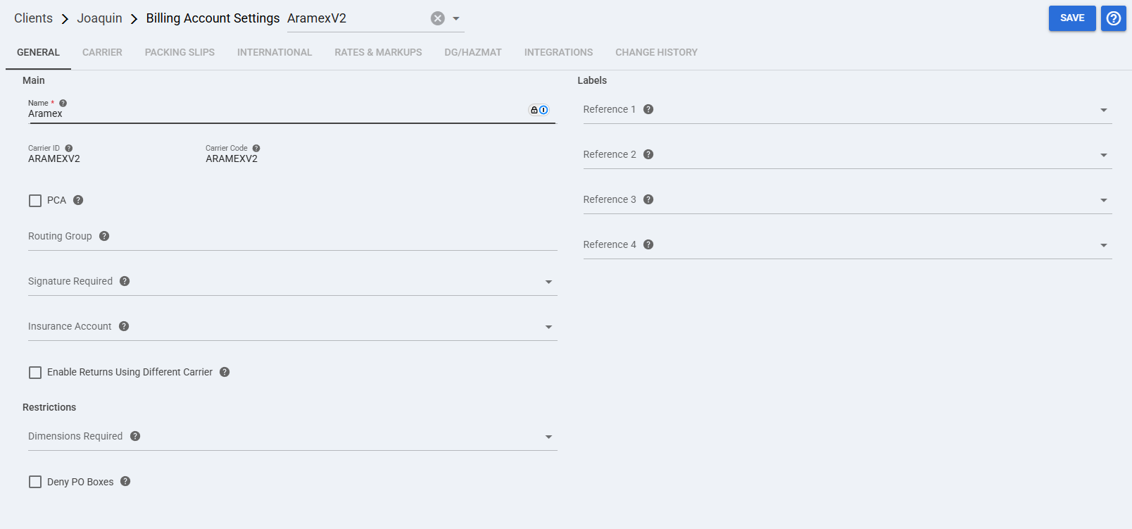 ![]() | Label References: These optional fields define which order reference values can be printed on the label for this Client (Billing) Account.
